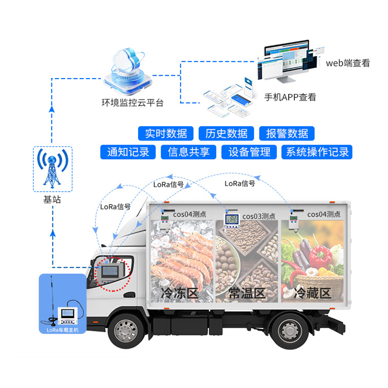 针对大型冷藏车,及车头和车厢分开的冷藏车,推荐使用LORA无线车载主机搭配LORA无线温湿度记录仪进行监测。测点与主机之间采用LoRa无线的方式进行通讯,使用时主机安装在驾驶室中,无线测点(1~4台)通过磁吸/吊绳的形式安装在车厢的任意多个点位进行监测,主机将接收的数据以4G的方式上传至环境监控云平台。