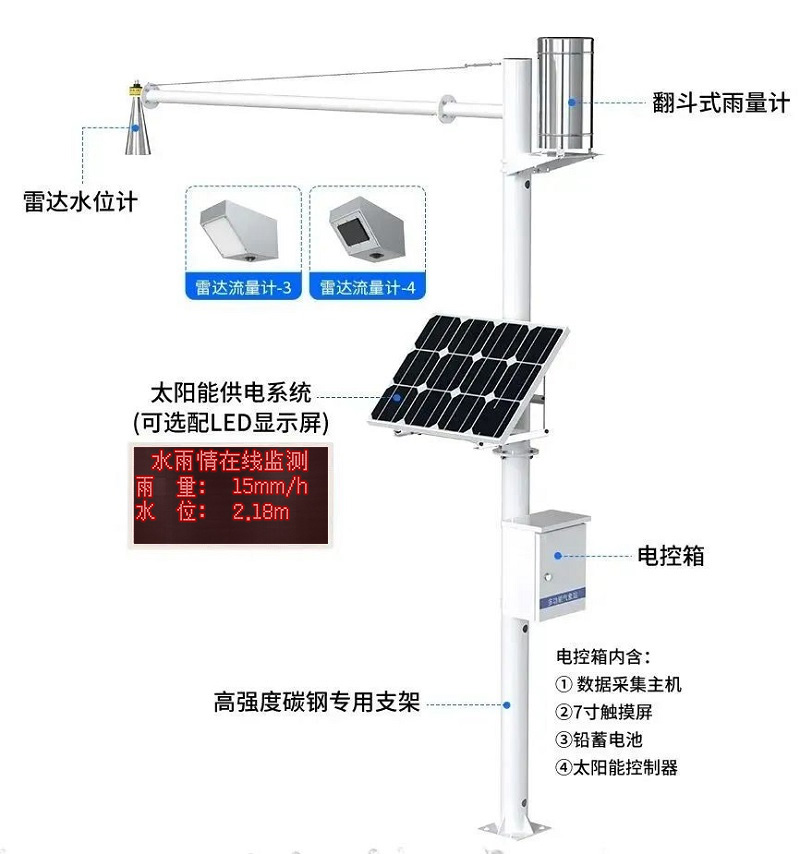 水雨情在线监测站上的雷达水位计和雷达流量计均采用一体式设计,不可拆分,不存在机械磨损情况,使用寿命长;采用雷达技术,非接触式测量,测量数据不受密度、PH、浑浊度、液面漂浮物影响,抗干扰能力强,能够及时捕捉水位异常波动,为防洪调度提供科学依据,有效避免或减少洪灾损失。