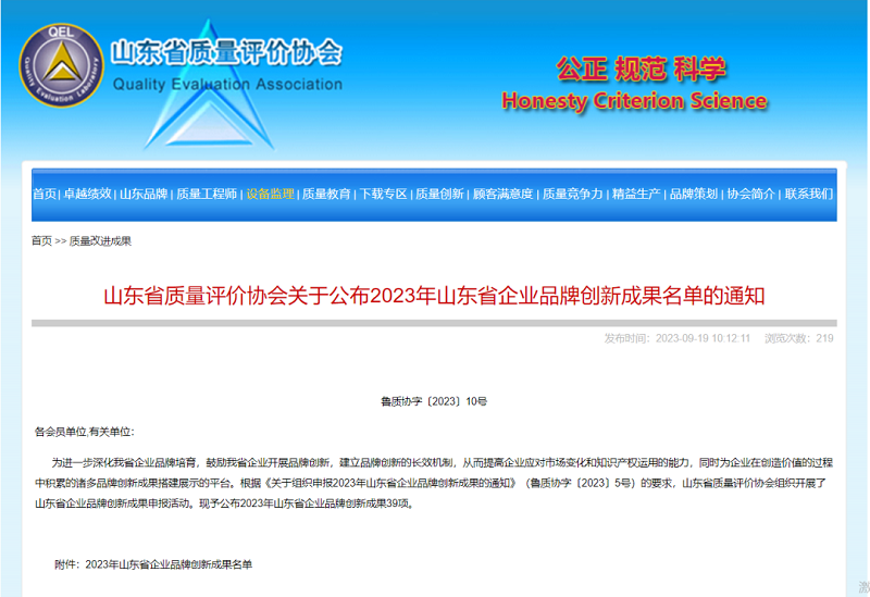 根据《关于组织申报2023年山东省企业品牌创新成果的通知》(鲁质协字〔2023〕5号)的要求,山东省质量评价协会组织开展了山东省企业品牌创新成果申报活动,本次活动经过层层筛选,共评选出39项企业品牌创新成果。