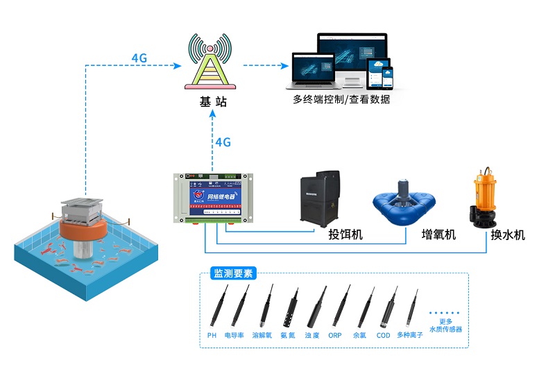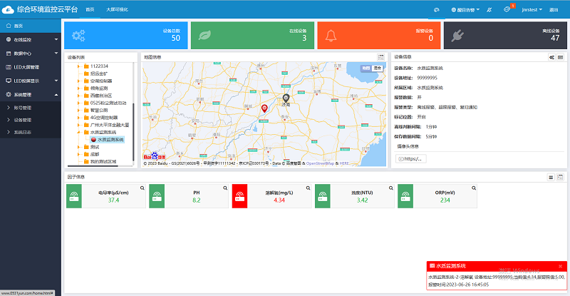 环境监控云平台是我公司自主研发的一款免费综合管控服务平台,能够随时随地查看监测数据,支持以短信、语音、邮件、微信的形式向用户推送超限报警、设备离线等重要通知,还拥有储存历史数据/报警数据以便后期查询和导出、远程对继电器(如:增氧机、水泵等)的状态(开启/关闭)进行控制、设置子账号并自由分配管理权限、接入现场摄像头对水面以及周围环境进行监控等功能。