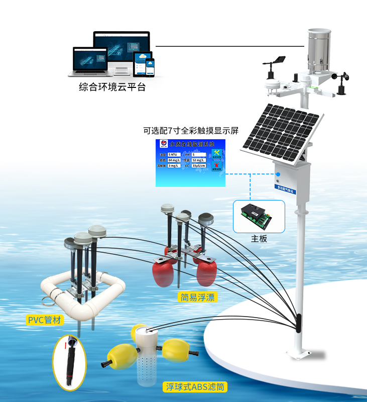 立杆式水质监测站的立杆式设计能让其更为牢靠的固定在河流堤坝、池塘岸边,以便对水质进行长期固定监测。用户可以根据使用环境选择简易浮漂款、PVC管材款或浮球式ABS滤筒款进行使用,在有需要的情况下还可以在电控箱内加配7寸全彩触摸屏,以便在现场查看水质监测参数、修改配置等。