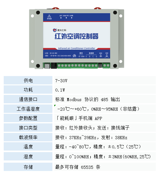在线式空调控制器可以通过设备上的红外接收学习空调控制器的红外码,进而代替遥控器对空调进行控制。设备可以通过设定周期、温湿度上下限、采集开关量信号以及设置多个时间段对现场的空调选择合适的方式进行自动控制。还可以通过标准Modbus-RTU 485通信协议对设备进行远程控制以及实现来电自启功能。只需要学习一台空调遥控器指令就可以实现多台设备配置,设备自带存储,记录空调用电总量、开关机控制失败以及温湿度超过上下限等内容。