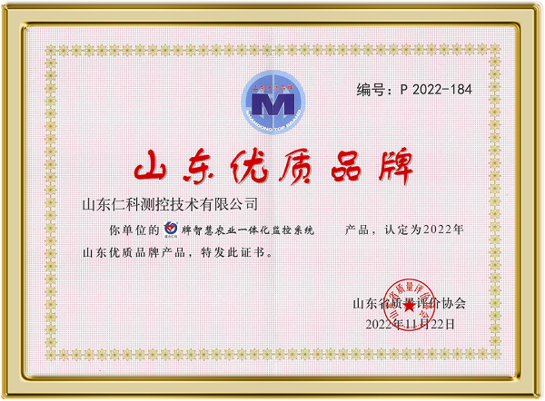 山东仁科测控技术有限公司智慧农业一体化监控系统产品,经山东省质量评价协会认定为“山东优质品牌产品”。