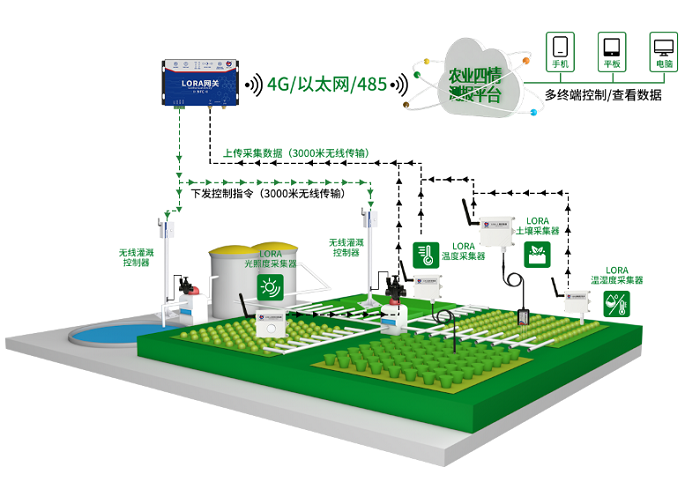 它可以依托部署在现场的各种LoRa传感器采集环境温湿度、光照强度等信息,通过LoRa网关将信息上传至农业四情测报平台。用户可以预先设置好灌溉设备运行的控制条件,从而实现定时/智能灌溉(在控制的过程中可以进行人为干预)。