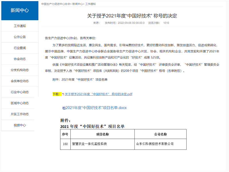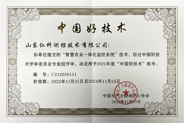依据《中国好技术项目征集和推广活动管理办法》有关规定,经“中国好技术” 评审委员会评审、“中国好技术”管理委员会审核,山东仁科测控技术有限公司智慧农业一体化监控系统被授予2021年度“中国好技术”称号。