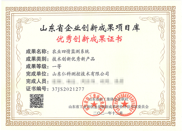 2021年12月,由山东省工业和信息化厅主办的2021年度“山东省企业优秀创新成果”认定工作落下帷幕,通过山东省企业发展促进中心专家组评审,山东仁科测控技术有限公司自研自产的《农业四情监测系统》获得 “优秀创新成果一等奖”。