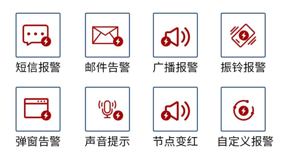 支持短信报警、邮件报警、振铃报警、广播报警等各种远程报警方式,也支持弹窗告警、声音提示、节点变红等界面报警方式,且报警的内容可自行设置,还可自定义报警时间段,使用更加灵活。