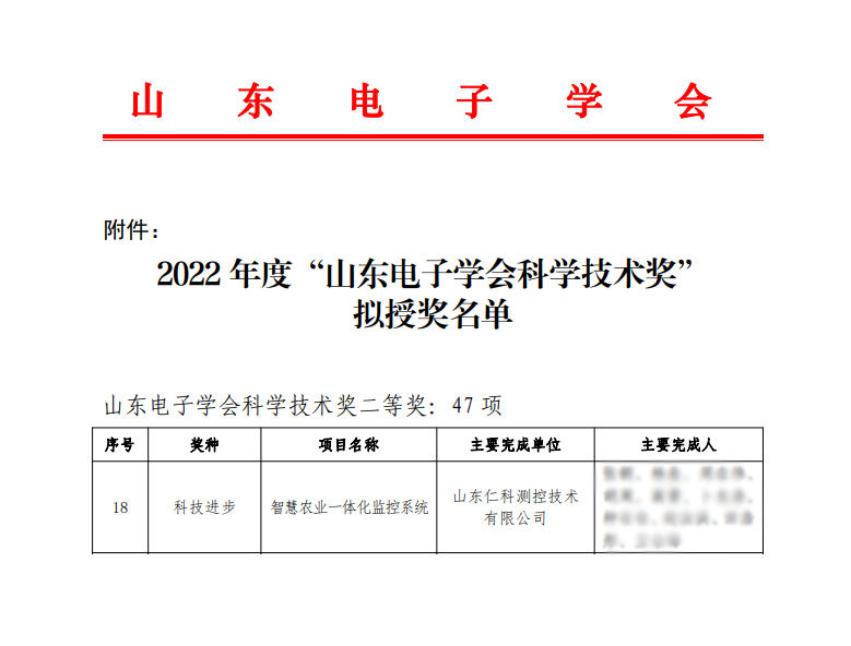 山东仁科测控技术有限公司(以下简称山东仁科)荣登榜单,其研发的“智慧农业一体化监控系统”荣获山东电子学会科学技术——“科技进步”奖。