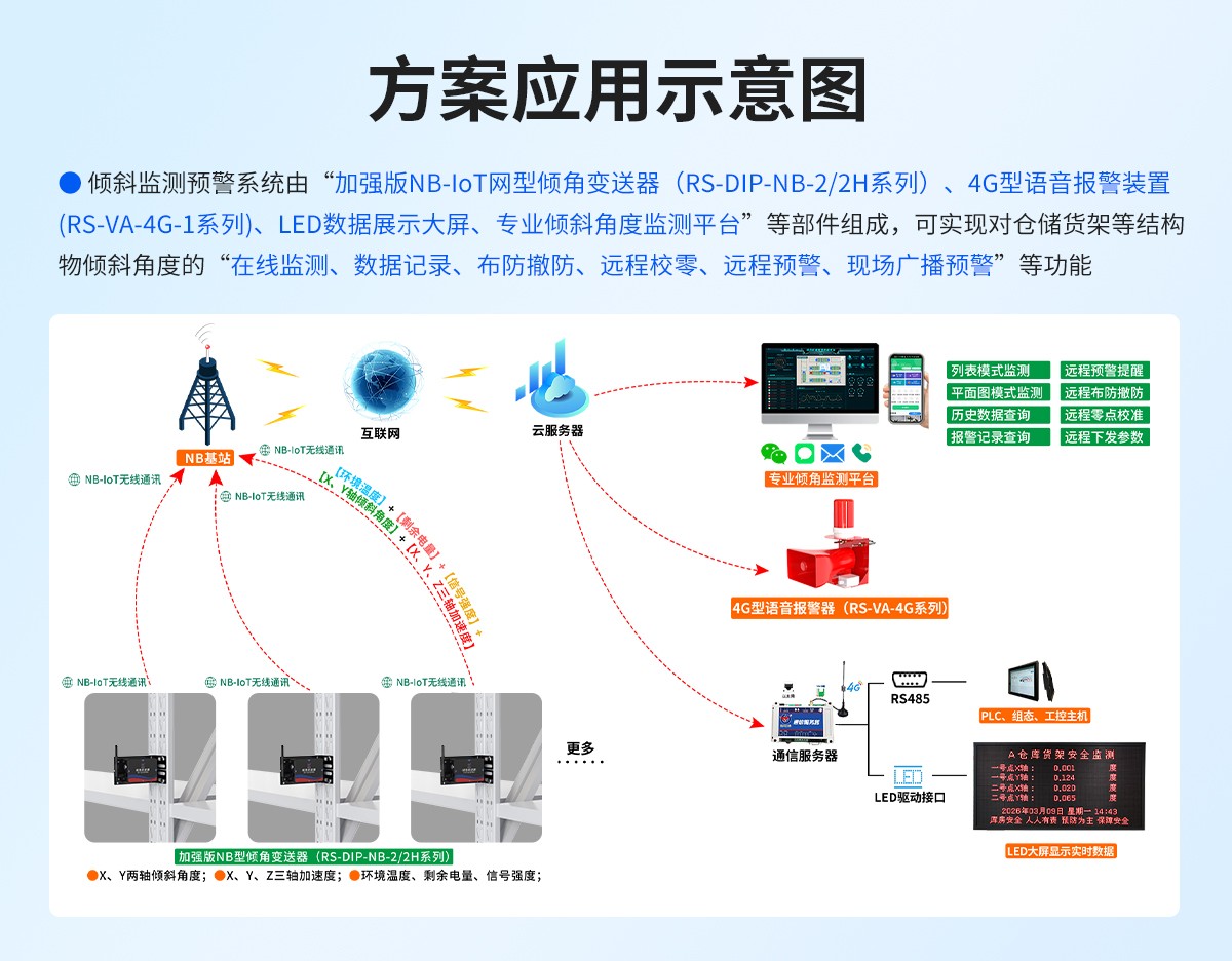 货架倾斜监测预警系统,是破解传统人工巡检频次低、误差大、盲区多等痛点的核心手段。我公司所研发生产的“倾斜监测预警系统”已应用于多个地区重点项目的仓储货架智能化改造,为各类仓储场景的安全管理需求提供了可落地的参考依据,助力仓储运营实现安全化、智能化升级。