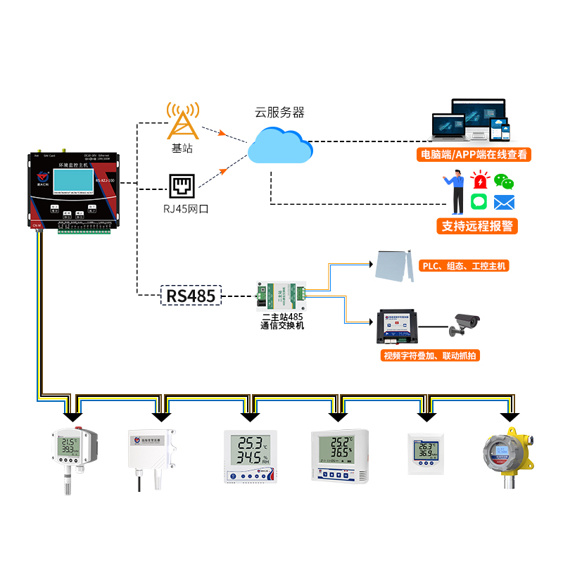 485型温湿度监测系统主要由485型温湿度变送器,环境监控主机和环境监控云平台组成。该系统中的485型温湿度变送器作为环境监测终端能够对空气温湿度变化进行24小时不间断采集,通过云平台。实现温湿度远程实时监测、数据存储、数据分析、超限告警等功能。