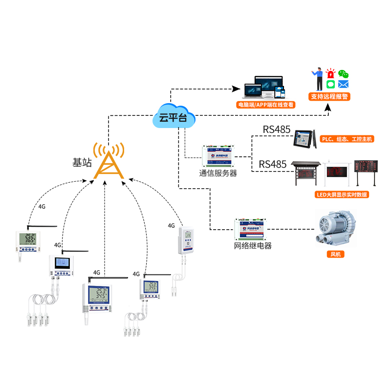 4G无线温湿度组网监测系统以4G温湿度传感器为监测终端,实时监测环境温湿度数据,以4G网络基站为信号传输媒介,插上SIM卡就能正常使用,依托我司免费提供的云服务、APP客户端,实现温湿度的远程在线监测、数据记录、曲线分析、远程告警、联动控制等多种物联网应用服务。