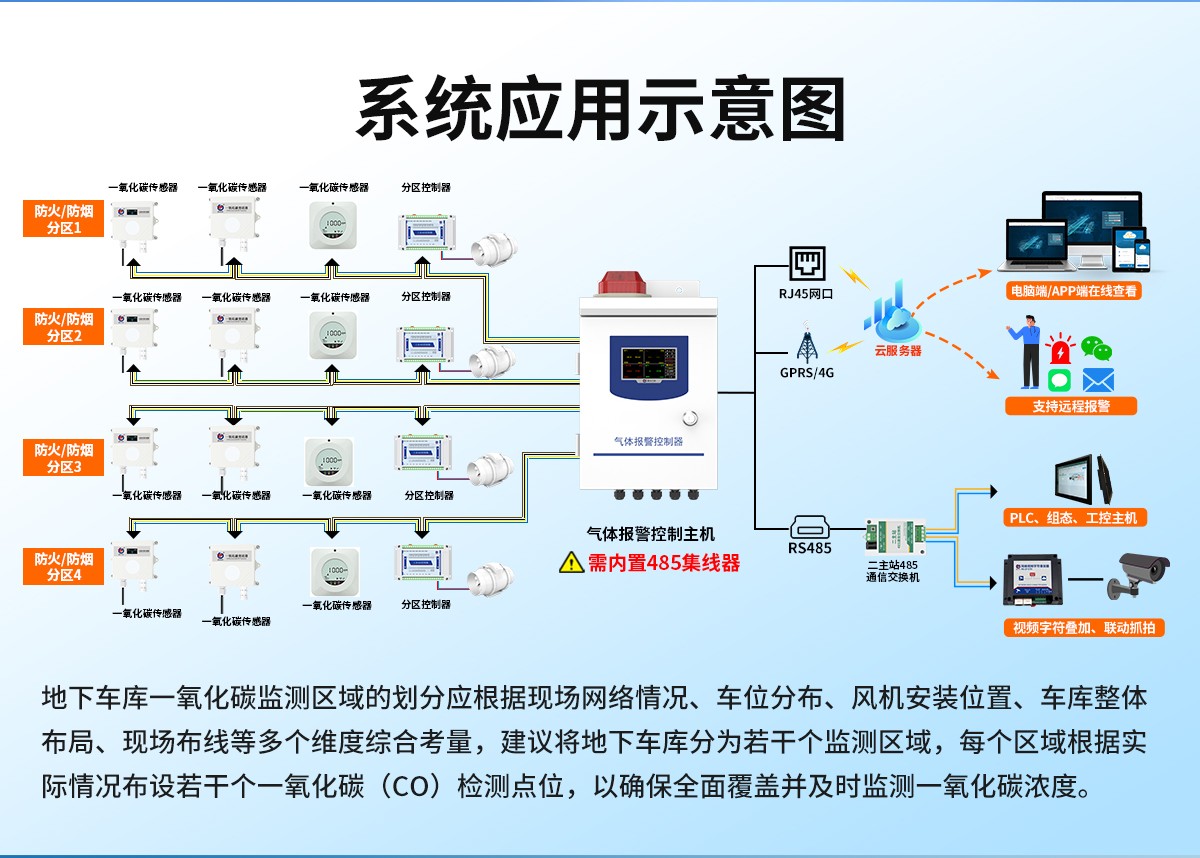 本系统由“RS485型一氧化碳(CO) 变送器、分区控制器、气体报警控制主机、字符叠加器、摄像头”等相关部件组成,基于RS485、以太网、4G等物联网通信技术,实现了车库内不同区域的“一氧化碳集中在线监控、风机启停控制管理”,在保障监控场所安全运行的同时,也满足了智能远程运维的可靠管控要求。