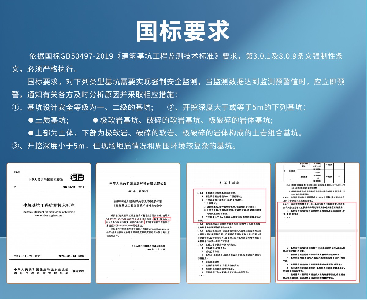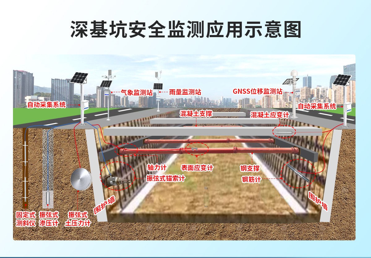 本方案依据国标要求,对基坑的支护结构受力情况、周围土体位移沉降情况、地下孔隙水压力情况进行全方位、高精度的实时在线监测。配合我司免费提供的监测预警平台,赋予基坑安全在线监测系统全天候的守护能力以及智能预警机制,政府主管部门、安全监督机构、各责任主体单位,通过系统能够及时查询辖区内在建工程基坑现场的监测数据,实现动态监管目的。