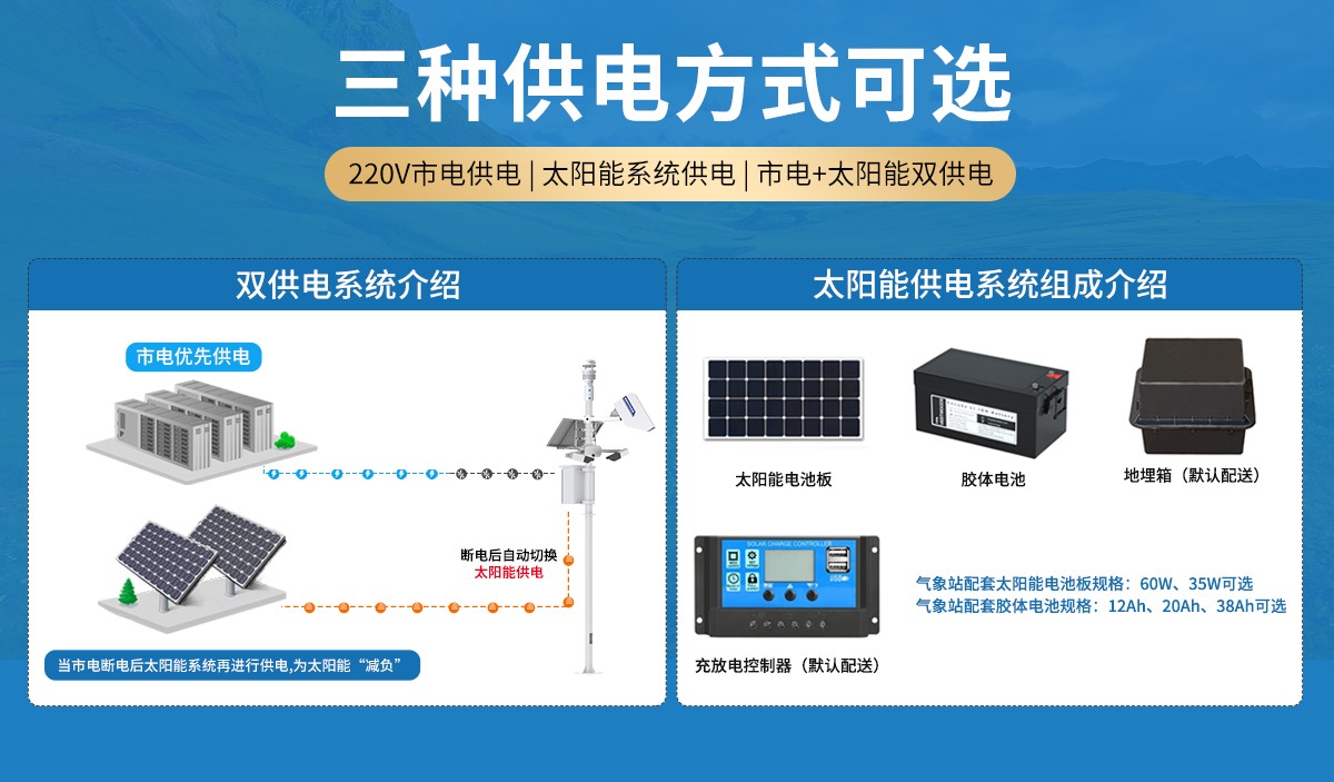 | 双供电 | 支持220V市电与太阳能板双供电 (优先市电供电,当市电断电后太阳能供电系统提供供电,设备正常工作不会间断) | ||