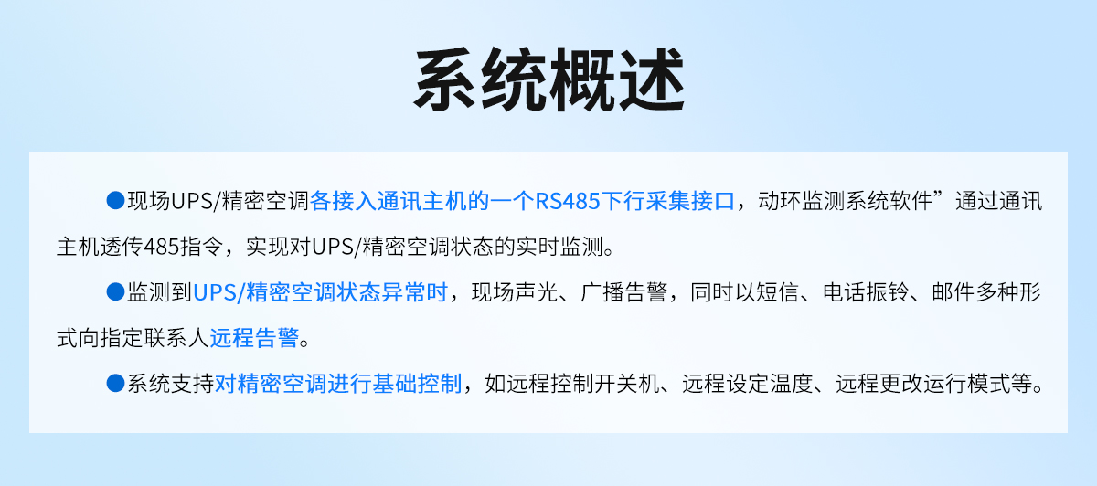 现场UPS接入我司通讯主机的一个RS485下行采集接口,动环监测系统软件通过“通讯主机”透传485指令,实现对UPS状态的实时监测。系统可实现UPS状态异常时,现场声光、广播告警,同时以短信、电话振铃、邮件多种形式向指定联系人远程告警。