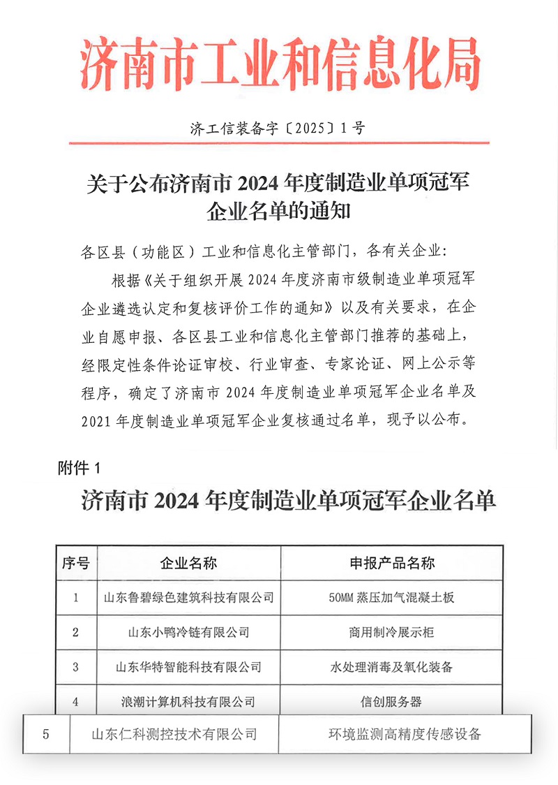 近日,济南市工业和信息化局公布了《2024年度济南市制造业单项冠军企业》名单,山东仁科凭借过硬的技术实力和创新能力在一众企业中脱颖而出,成功入选。