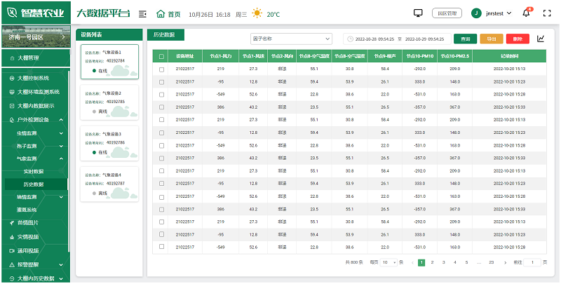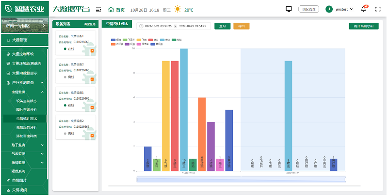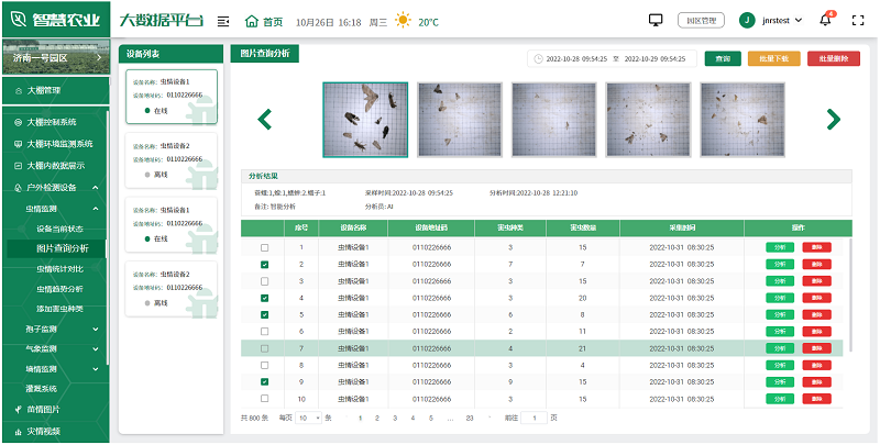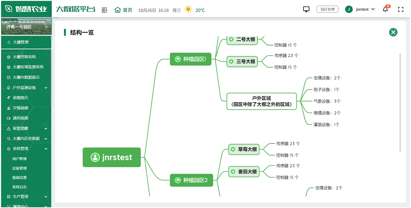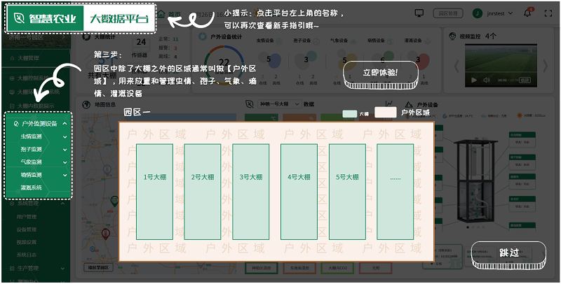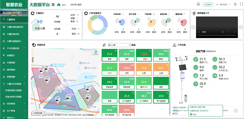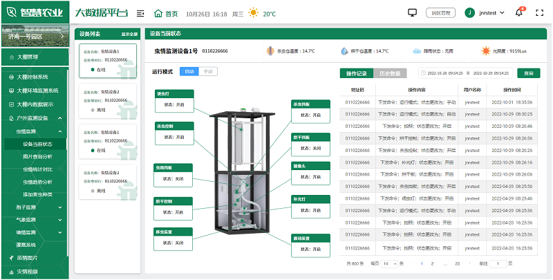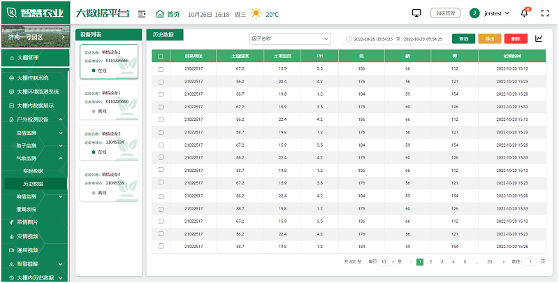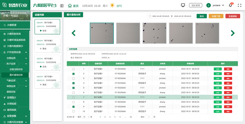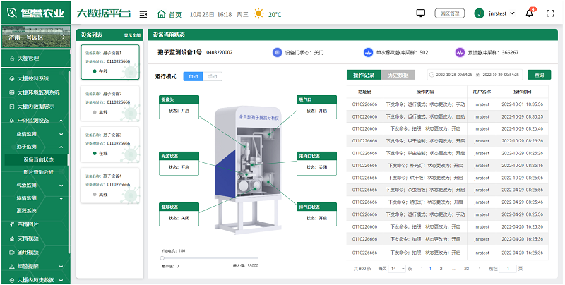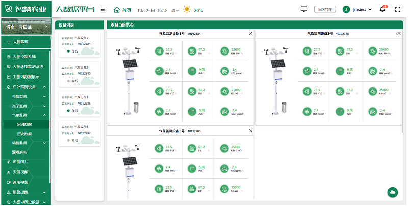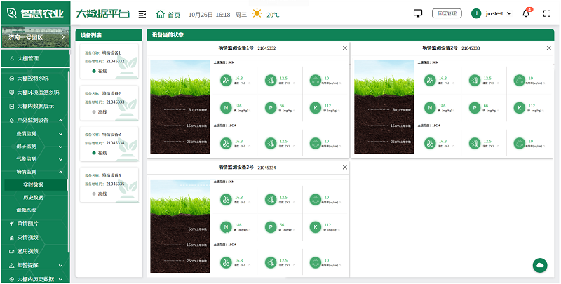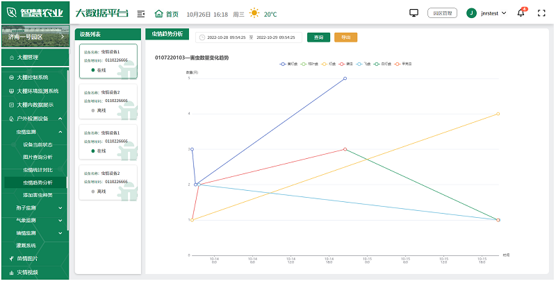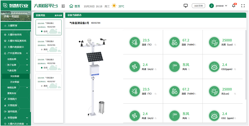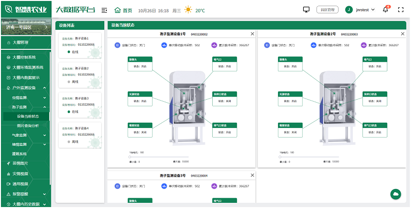 用户可根据实际情况,选择安装在园区的各种监测设备,如土壤湿度传感器、气象站、虫情测报仪、孢子捕捉分析仪等,全面监测园区的环境变化,及时发现并解决生产中的问题,为未来的农业生产提供科学依据。