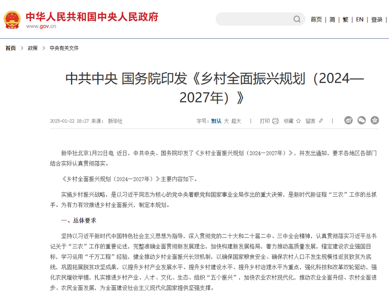 中共中央、国务院也于近日印发了《乡村全面振兴规划(2024—2027年)》,并发出通知,要求各地区各部门结合实际认真贯彻落实。