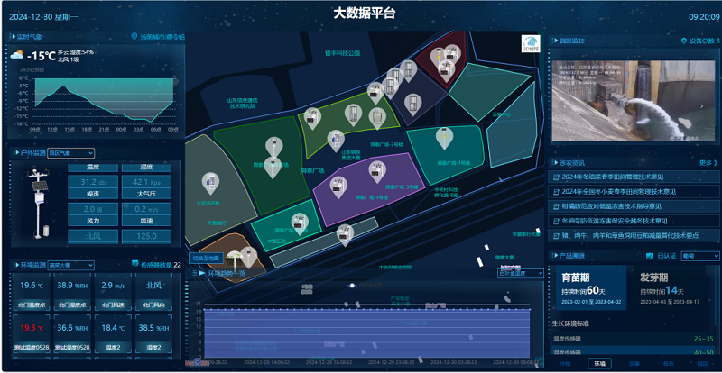 平台的大屏可视化界面能够科技直观的轮显园区内设备数据和曲线,同时展现了园区的天气状况、地图规划和设备点位、摄像头画面、农业资讯、溯源信息等,功能强大的同时,视觉上炫酷高级,信息上直观突出,达到了科技感与实用性并存的效果。
