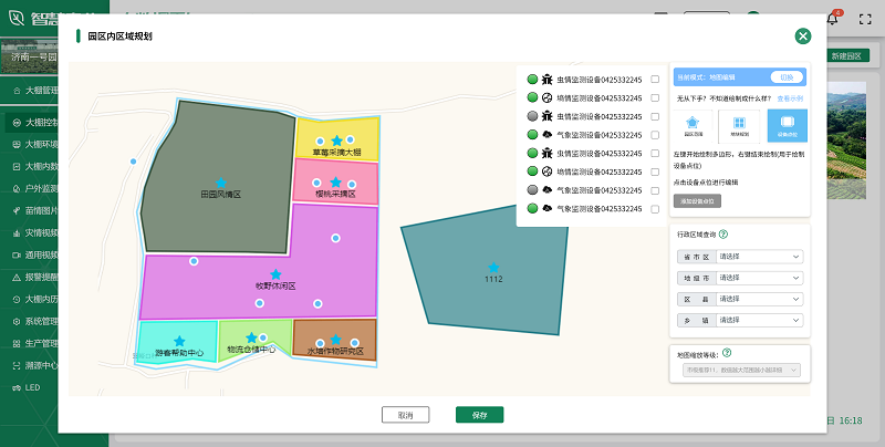在智慧农业大数据平台上,园区规划模块提供了科学的决策支持工具。通过整合地理信息系统(GIS)和大数据分析,平台能够帮助农业管理者全面了解园区的土地资源、气候条件、土壤类型等关键信息,从而进行合理的种植规划和资源配置。
