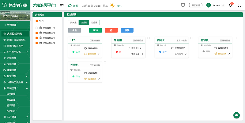 智慧农业大数据平台通过连接各种智能传感器和设备,实现了对棚内/户外环境的实时监测和精准调控。平台可以实时收集温湿度、光照强度、二氧化碳浓度等关键参数,还拥有开关量、正反转、百分比控制功能,能够通过数据分析,自动调节棚内环境,也能通过手机或电脑随时进行远程控制,确保作物在最适宜的条件下生长,实现智能管理。