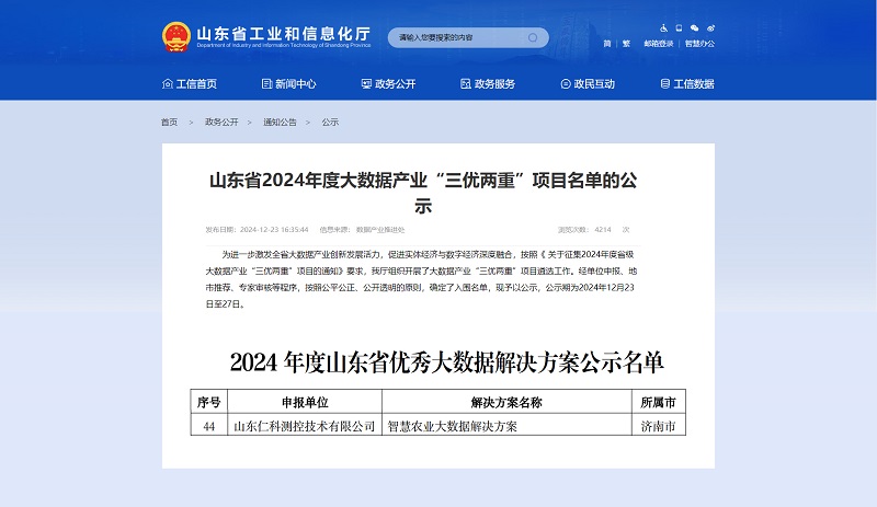 近日,《山东省2024年度大数据产业“三优两重”项目名单》公示,我公司自主研发的“智慧农业大数据解决方案”成功入选,彰显了山东仁科在智慧农业领域的技术实力,也标志着其在切实提升大数据产业发展水平、促进实体经济与数字经济深度融合、推动农业数字化转型中的突出贡献。