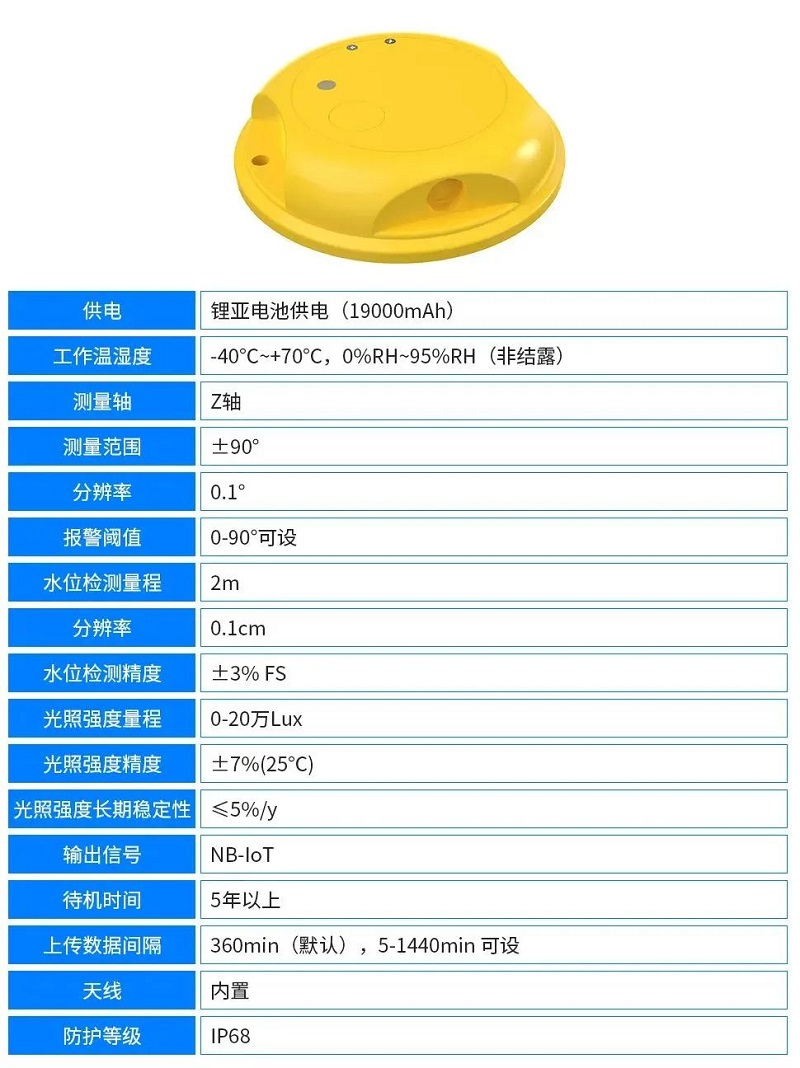 智能井盖传感器采用卡尔曼滤波算法测量倾角、时差法测量水位,数据精确、稳定;支持按照使用环境,一键校准倾角水平;可根据数据正常/报警情况,自动切换上传间隔,节约用电;内置超大电池,无倾斜的情况下可持续使用 5 年;IP68防护等级,无论刮风下雨都不影响设备测量,可帮助用户对各类井盖进行快速有效的管理,减少安全隐患,保障人民生命财产安全。