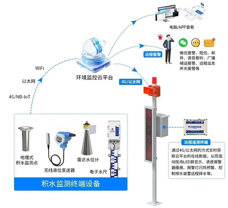 积水监测站能够实时监测积水情况,现场 LED 屏会同步轮显,为过往行人和车辆进行实时提醒,一旦水位超限会触发号筒扬声器和光报警器双重报警,也可通过平台远程查看各地积水数据,为城市排水防涝工作提供有力支持,提高城市的防灾减灾能力,保障城市交通顺畅和市民出行安全。