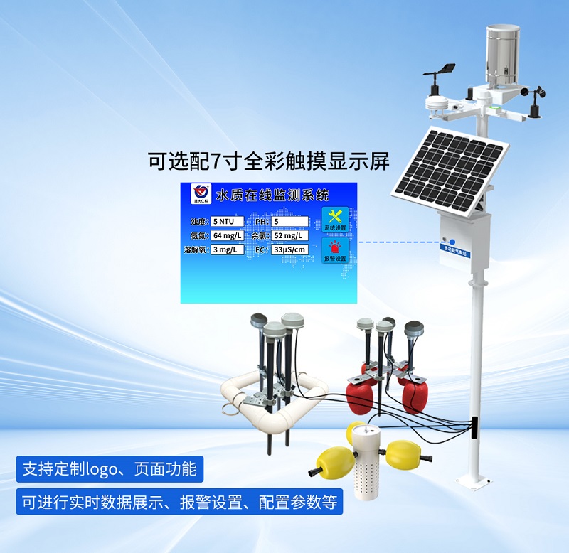 除水质取水监测平台外,客户还可以根据需求为立杆式水质监测站选配7寸触摸屏,直接安装在电控箱内,同样全彩显示画面,可以进行实时数据展示、报警设置、配置参数等,还支持定制logo、页面功能!