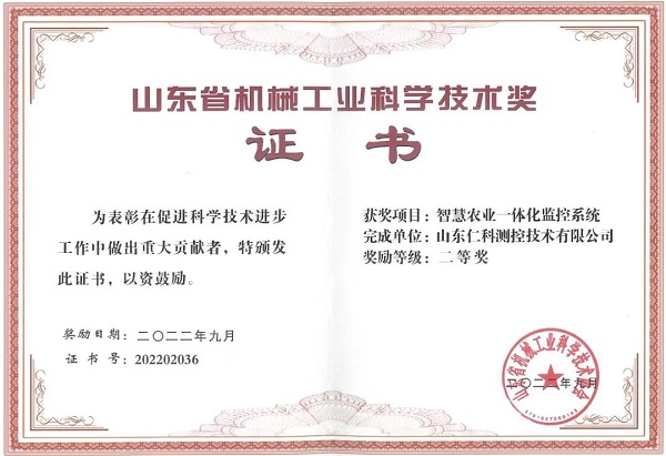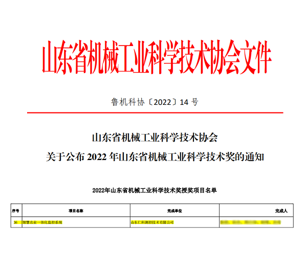 根据山东省机械工业科学技术协会公布的《2022年山东省机械工业科学技术奖授奖项目名单》,山东仁科 《智慧农业一体化监控系统》 成功上榜,荣获 “ 山东省机械工业科学技术奖 ” !