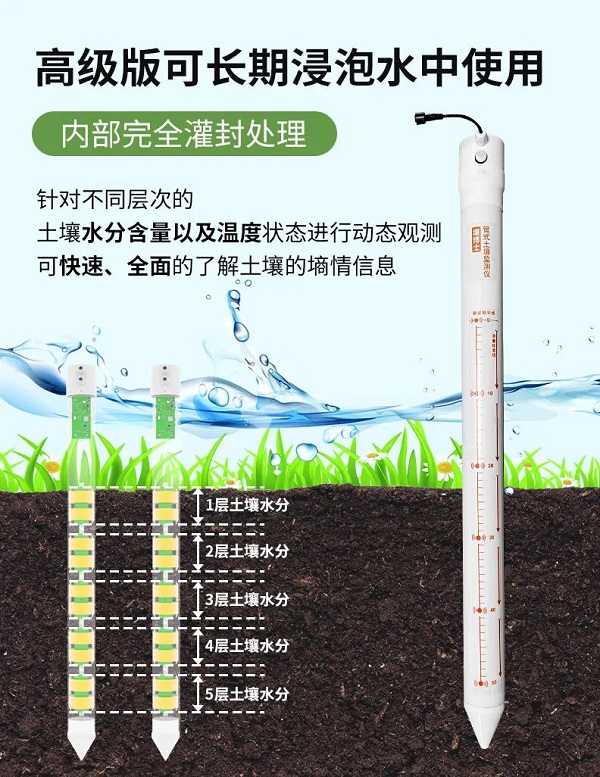管式土壤墒情监测仪采用全面灌封技术,从内部发射近1G 赫兹的高频探测波,可以有效感知周围的土壤环境。在测量过程中不受土壤中盐离子的影响,就算是化肥、农药、灌溉等农业活动也不会影响其检测结果。并且,传感器的电极不会与土壤直接接触,成功避免了电力对土壤及土壤环境中植物的干扰。