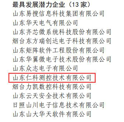 山东仁科测控技术有限公司成功入选2021年山东省电子信息行业优秀企业,并荣获“最具发展潜力企业”称号,一同入选山东省电子信息行业优秀企业的还有浪潮电子信息产业、海信集团、歌尔股份等公司。