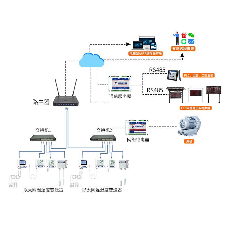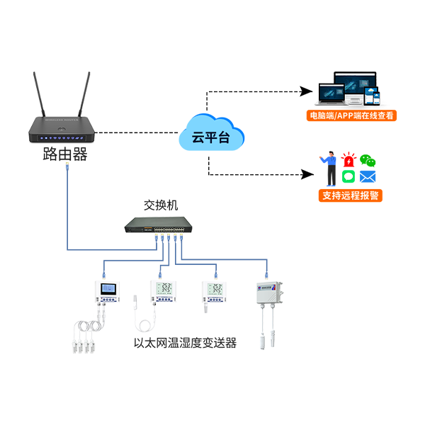 以太网型温湿度监测系统以以太网温湿度传感器为监测终端,实时监测环境温湿度数据,借助以太网网络,连接交换机/路由器,实现“局域网跨网段、广域网跨网关”通信。我司免费提供的云服务、APP客户端,可实现温湿度的远程在线监测、数据记录、曲线分析、远程告警、联动控制等多种物联网应用服务。