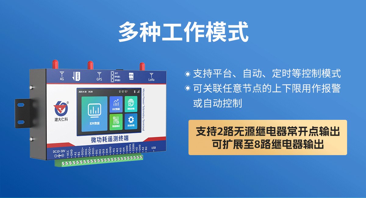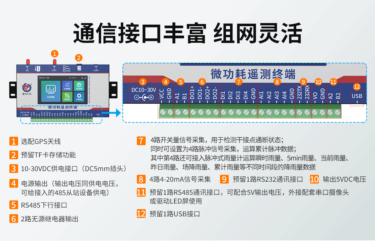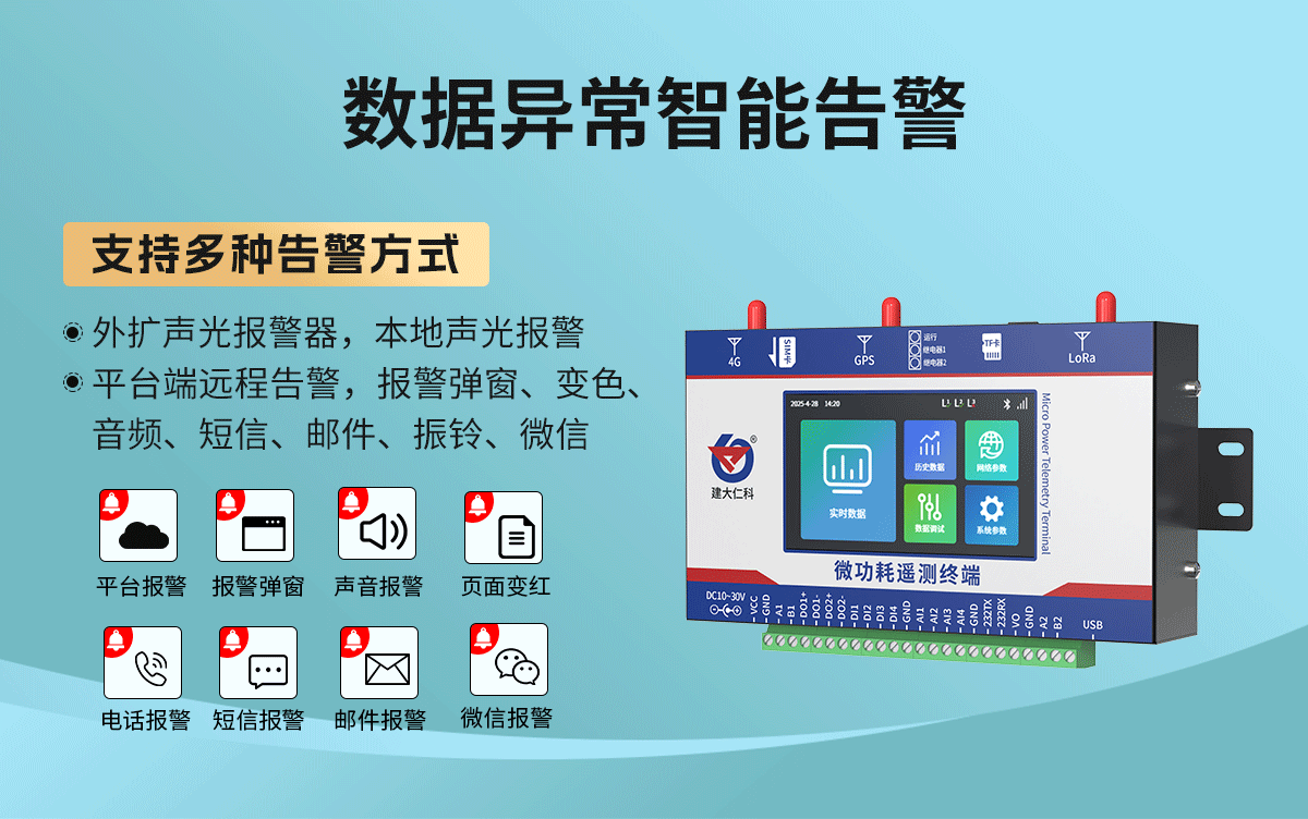 | 4路开关量输入通道 | 可检测干接点通断状态 | 可采集开关量或脉冲计数(外接电表使用);第四路可外接脉冲雨量计 |