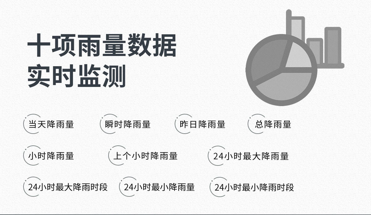 一体式雨量监测站集成翻斗式雨量计、数据采集主机、立杆支架、电控箱、太阳能供电系统等部件,可监测当天降雨量、瞬时降雨量、昨日降雨量、总降雨量、小时降雨量、上个小时降雨量、24小时最大降雨量、24小时最大降雨时段、24小时最小降雨量、24小时最小降雨时段等十项雨量数据。提供免费云平台,支持二次开发。